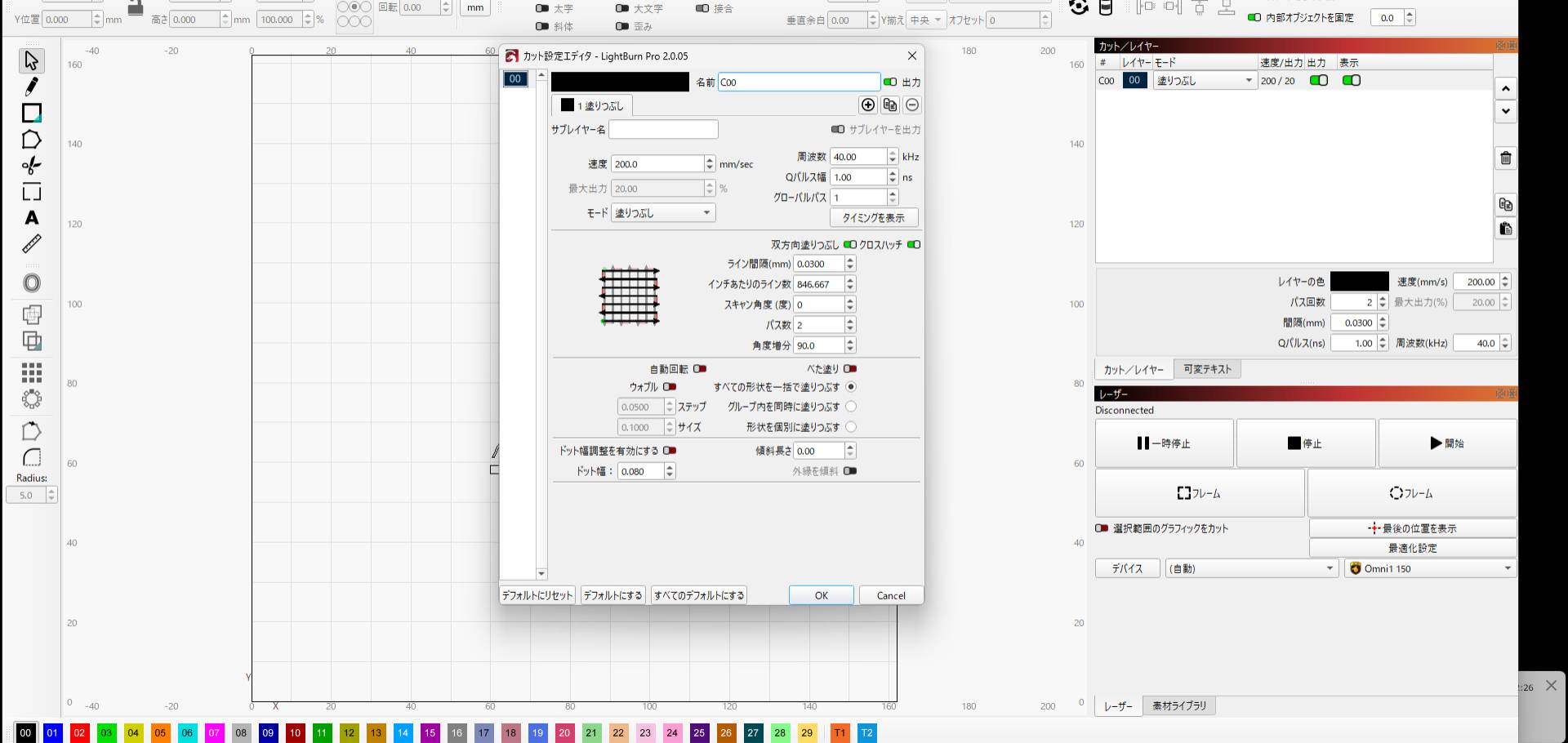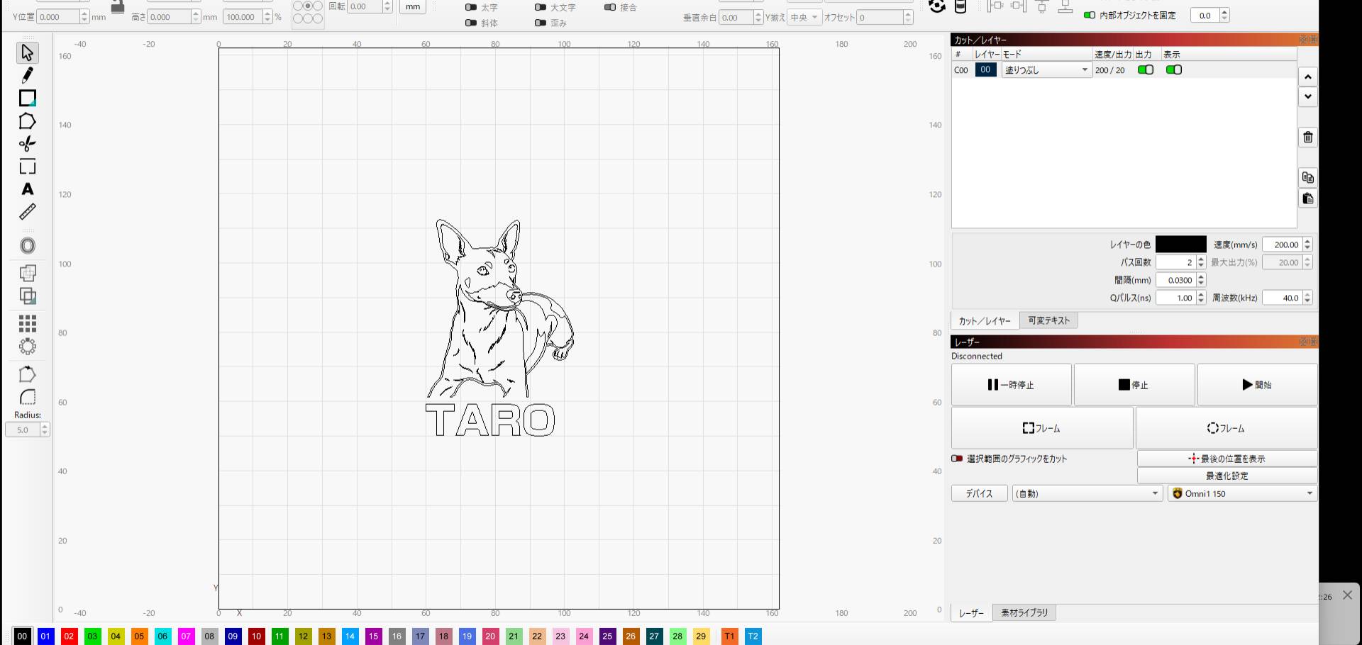 1、レーザー用アプリ(lightbun)に、イラレデータをインポート、サイズ等設定